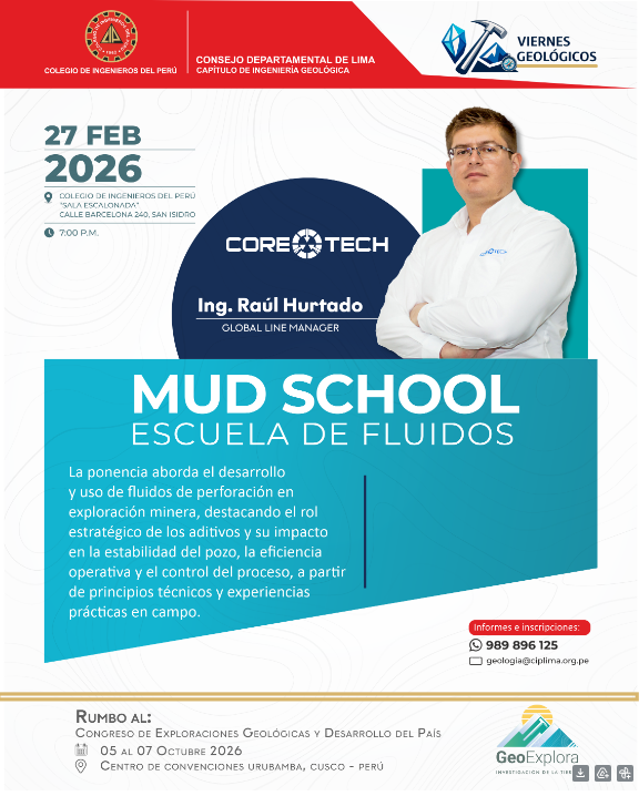 El CapΓ­tulo de IngenierΓ­a GeolΓ³gica del CIP Lima presenta una nueva ediciΓ³n de π•πˆπ„π‘ππ„π’ π†π„πŽπ‹πŽΜπ†πˆπ‚πŽπ’, con la Conferencia β€œMUD SCHOOL – Escuela de Fluidos”, por la empresa Core Tech a cargo del Ing. RaΓΊl Hurtado, Global Line Manager.