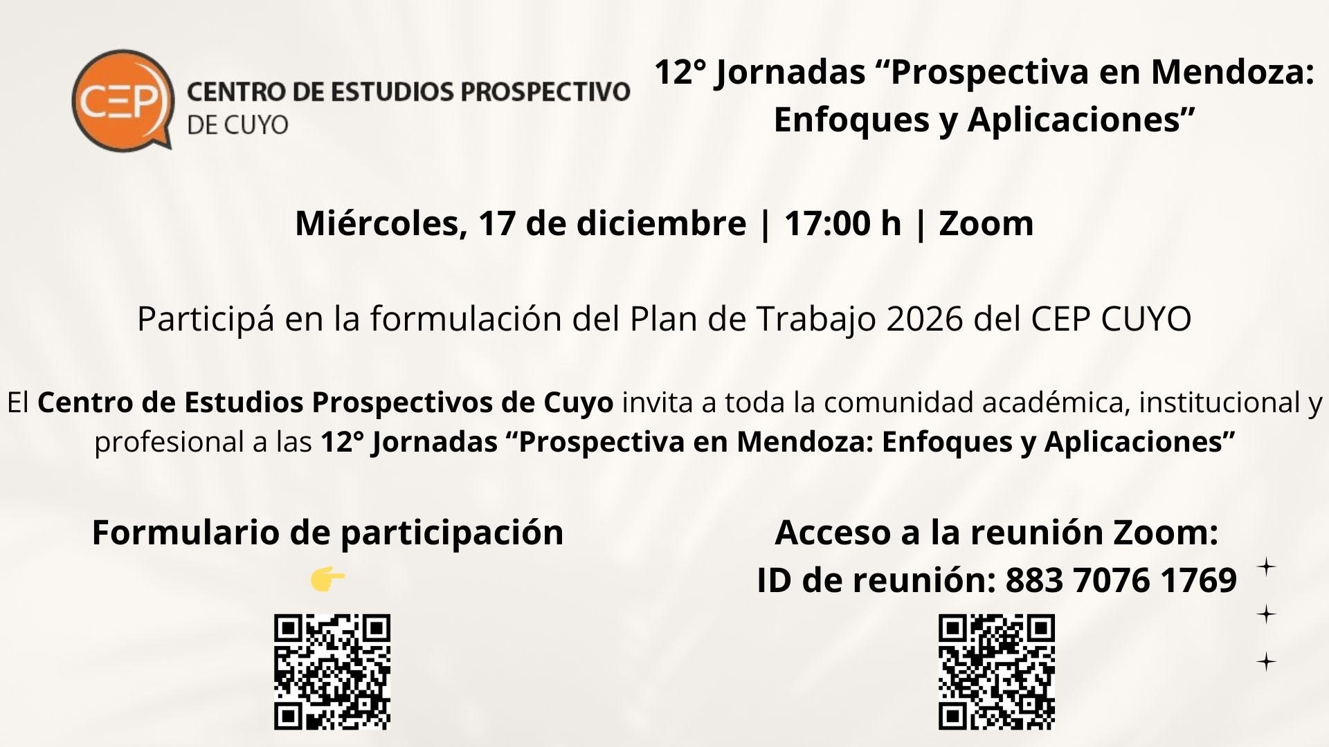 El Centro de Estudios Prospectivos de Cuyo (CEP CUYO) anunció la realización de las 12° Jornadas “Prospectiva en Mendoza: Enfoques y Aplicaciones”, que tendrán lugar el miércoles 17 de diciembre a las 17:00 h, en modalidad virtual vía Zoom.