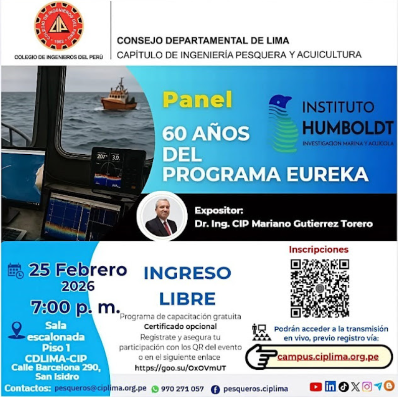 La Junta Directiva del Capítulo de Ingeniería Pesquera y Acuicultura del CDLIMA CIP y el Instituto Humboldt de Investigación Marina y Acuícola, invitan a participar del Panel: