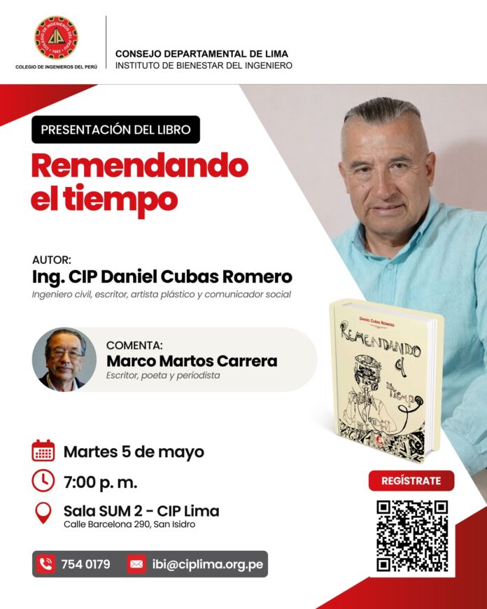 El Consejo Departamental de Lima, a través del Instituto de Bienestar del Ingeniero, los invita a ser parte de la Presentación del libro “Remendando el Tiempo”, escrito por el Ing. CIP Daniel Cubas Romero