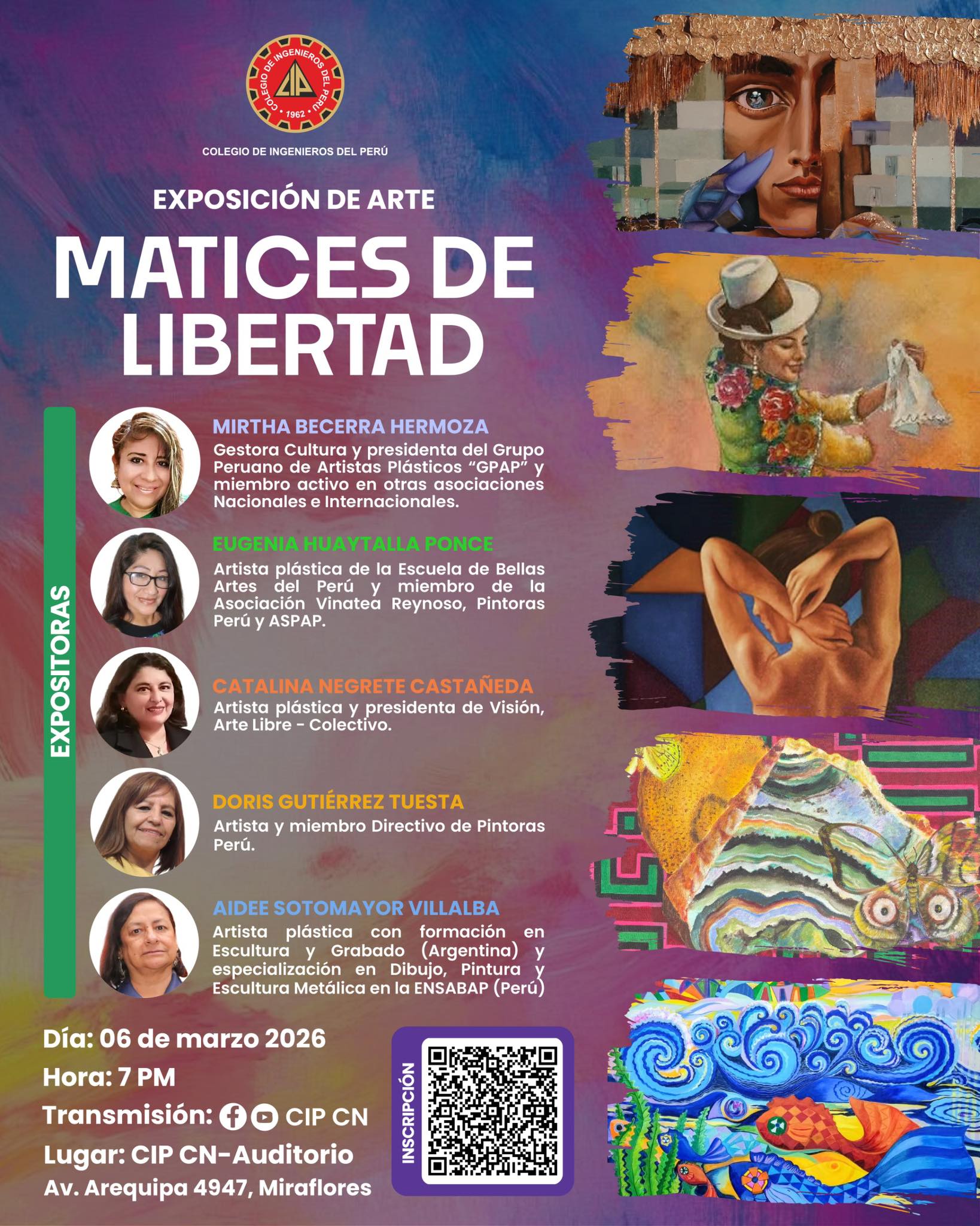 El Colegio de Ingenieros del Perú invita a la inauguración de la exposición colectiva “Matices de Libertad”, una muestra que reúne el talento y la sensibilidad de destacadas artistas nacionales, quienes a través de diversas técnicas y estilos nos invitan a reflexionar sobre la libertad desde múltiples perspectivas.