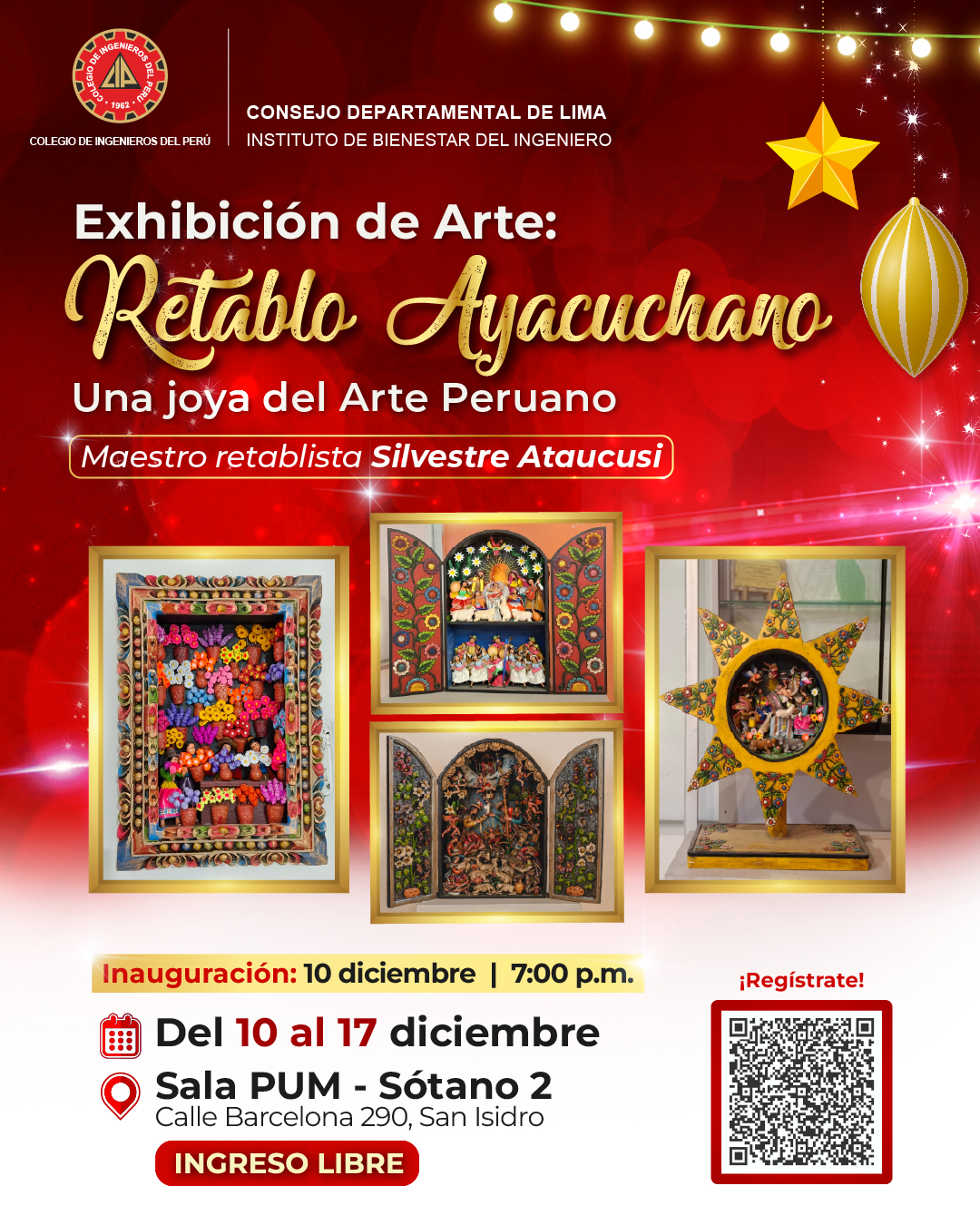 Ciencia – Artesanía & Cultura (Inaug. 10-12-25, 7 p.m.): Exhibición Arte: “RETABLO AYACUCHANO, UNA JOYA DEL ARTE PERUANO” – Sala PUM (Sótano 2), CDLima / Del 10 al 17 diciembre, 10h00 – 20h00.