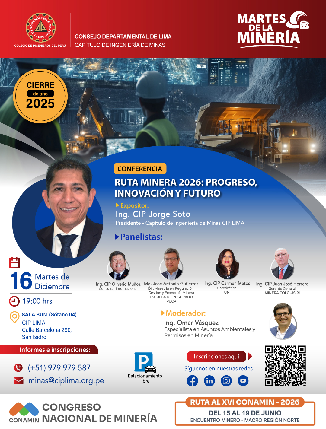 Clausura MARTES DE LA MINERÍA 2025: “RUTA MINERA 2026: Progreso, Innovación y Futuro”- SALA SUM – CIP Lima / 16 diciembre, 19:00 hrs.