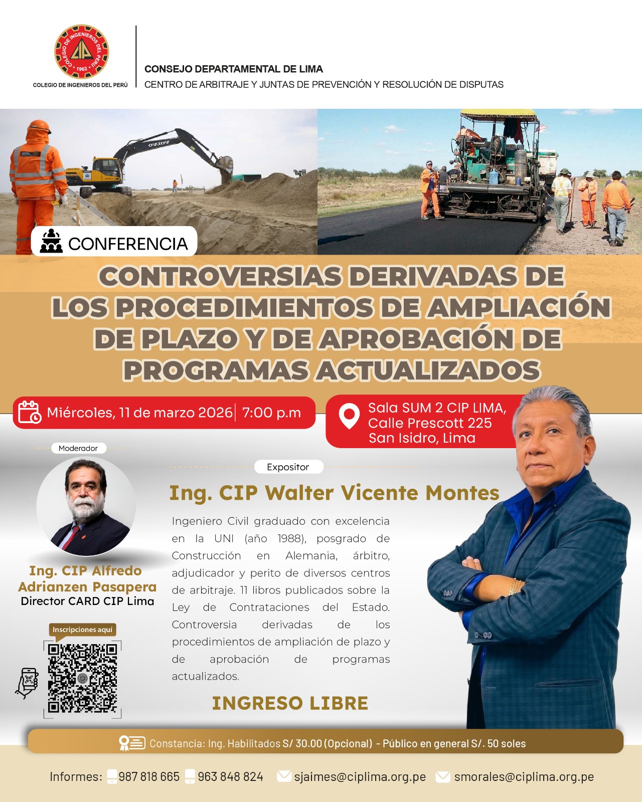 Constancia: Ing. Habilitados S/ 30.00 (Opcional) – Público en general S/. 50 soles
