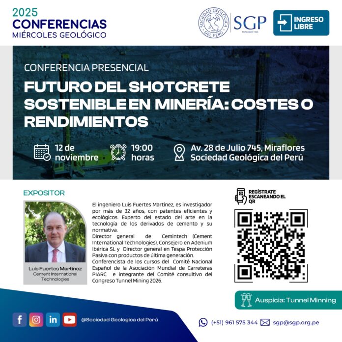 Conferencia: “Futuro del Shotcrete Sostenible en Minería: COSTES O RENDIMIENTOS” – Sociedad Geológica del Perú / 12 noviembre, 7:00 p.m.