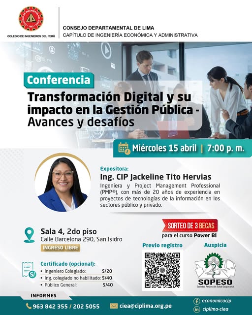 Conferencia: “TRANSFORMACIÓN DIGITAL Y SU IMPACTO EN LA GESTIÓN PÚBLICA – Avances y Desafíos” – Sala 4, 2do. Piso / Miércoles 15 abril; 7:00 p.m.