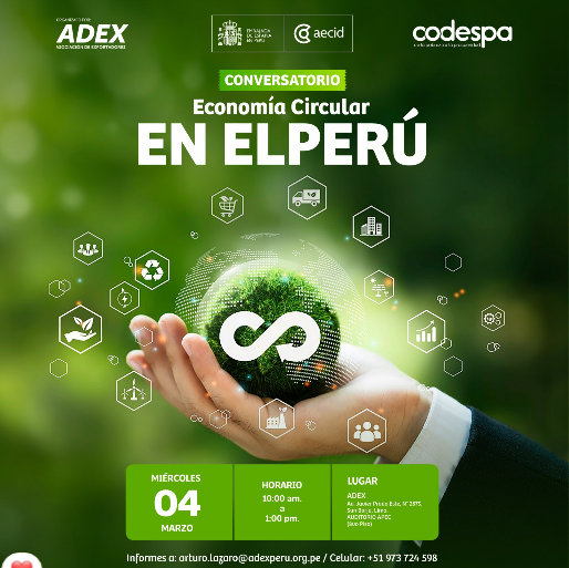 Conversatorio de Economía Circular | ADEX – CODESPA Te invitamos a participar en un espacio de diálogo sobre economía circular, emprendimiento y conocer sobre oportunidades de financiamiento, con experiencias prácticas de territorios rurales de Cajamarca y Amazonas, por Fundación CODESPA, con el apoyo financiero de AECID.