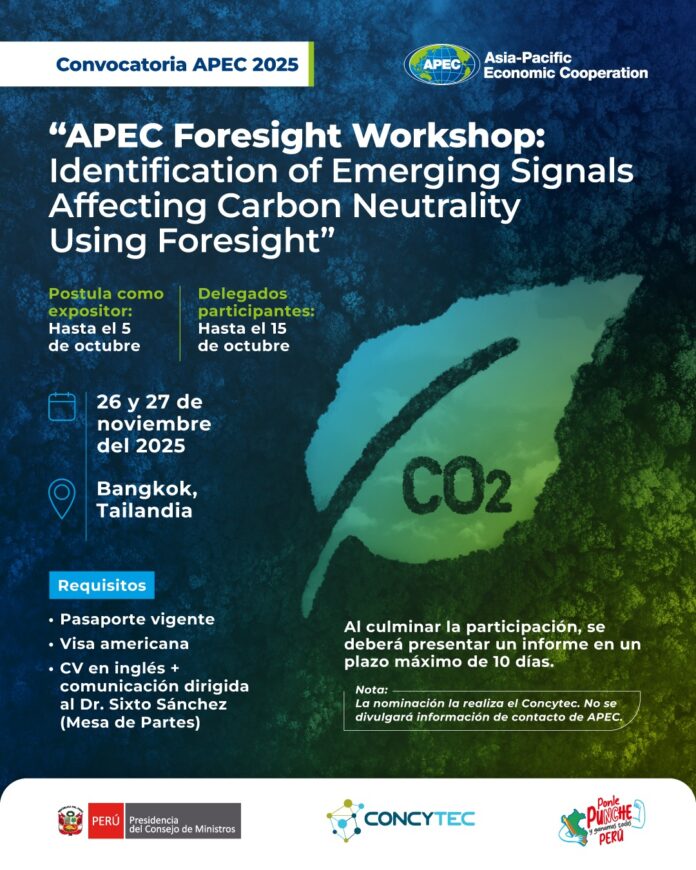 Convocatoria APEC 2025: “IDENTIFICACIÓN DE SEÑALES EMERGENTES QUE AFECTAN LA NEUTRALIDAD DE CARBONO MEDIANTE PROSPECTIVA” / 26 y 27 noviembre – Bangkok, Tailandia.