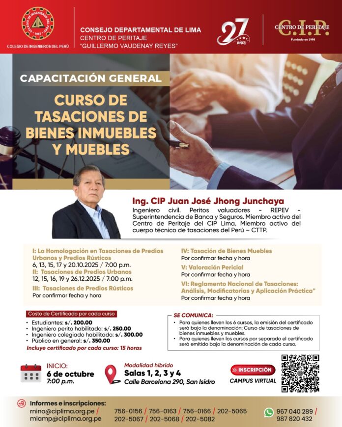 El Centro de Peritaje ¨Guillermo Vaudenay Reyes¨ del CIP Lima, organiza esta capacitación general a cargo del Ing. CIP Juan José Jhong Junchaya. Registrate en el campus virtual.
