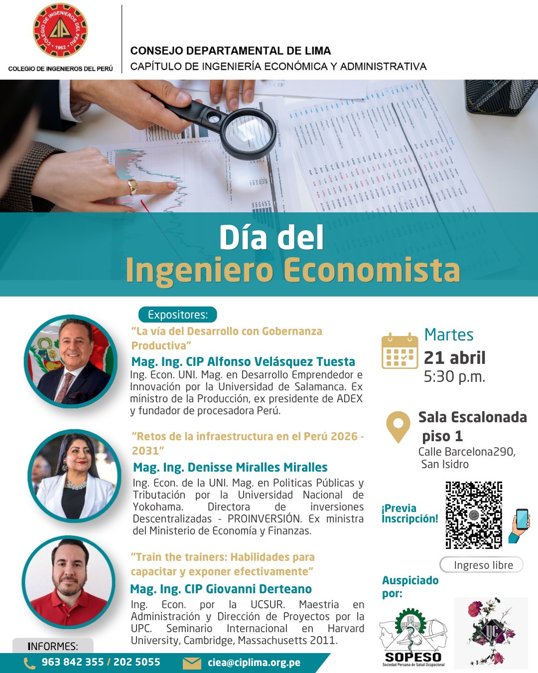 El Consejo Departamental de Lima del Colegio de Ingenieros del Perú, a través del Capítulo de Ingeniería Económica y Administrativa, tiene el honor de invitarle a la conmemoración del Día del Ingeniero Economista.