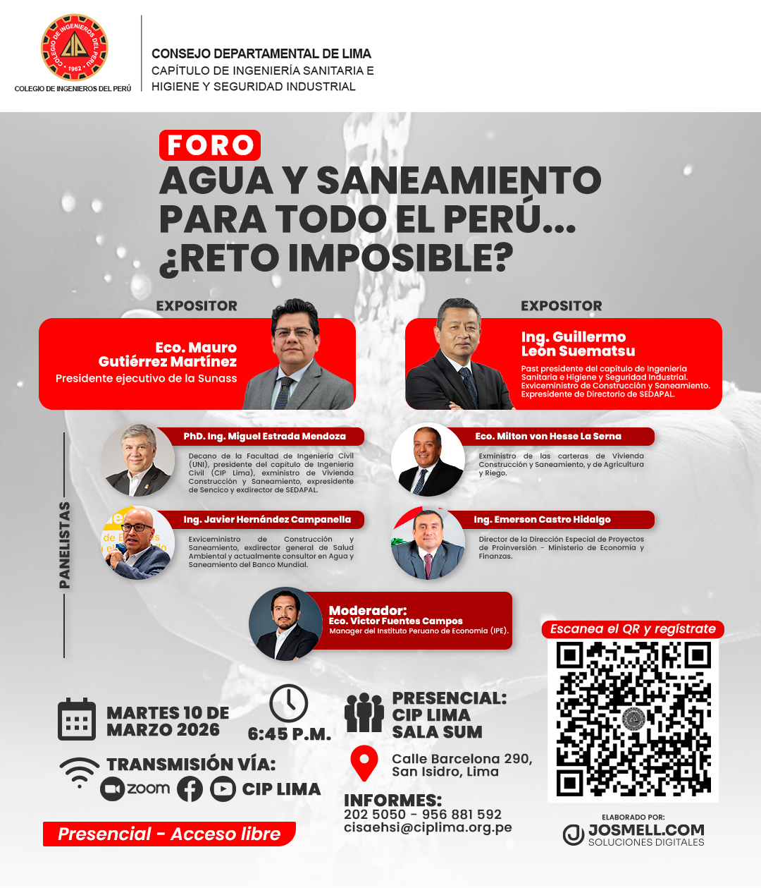 El Capítulo de Ingeniería Sanitaria e Higiene y Seguridad Industrial del CIP Lima, los invita a participar de este foro presencia. Ingreso previa inscripción.