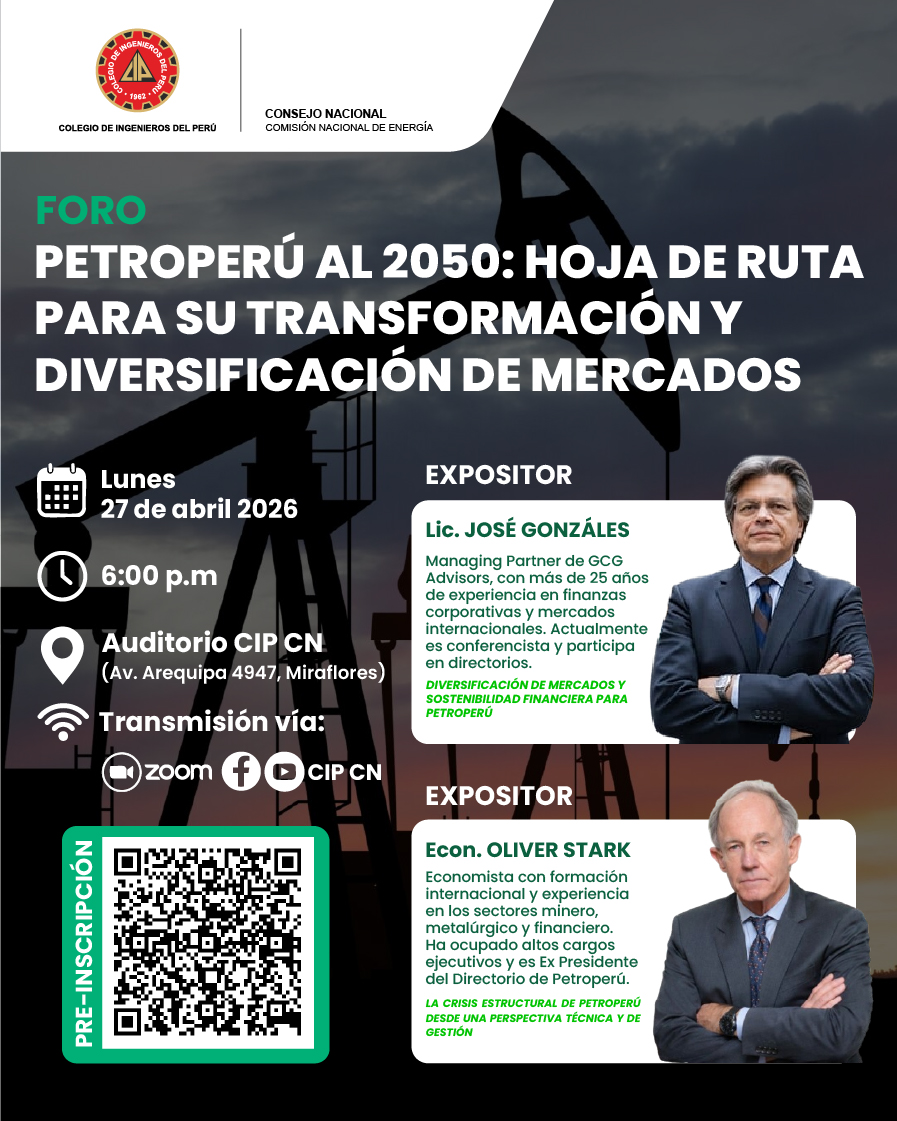El Colegio de Ingenieros del Perú – Consejo Nacional, a través de la Comisión Nacional de Energía, organiza este foro para analizar los retos, perspectivas y oportunidades de transformación de Petroperú frente a los cambios del sector energético.