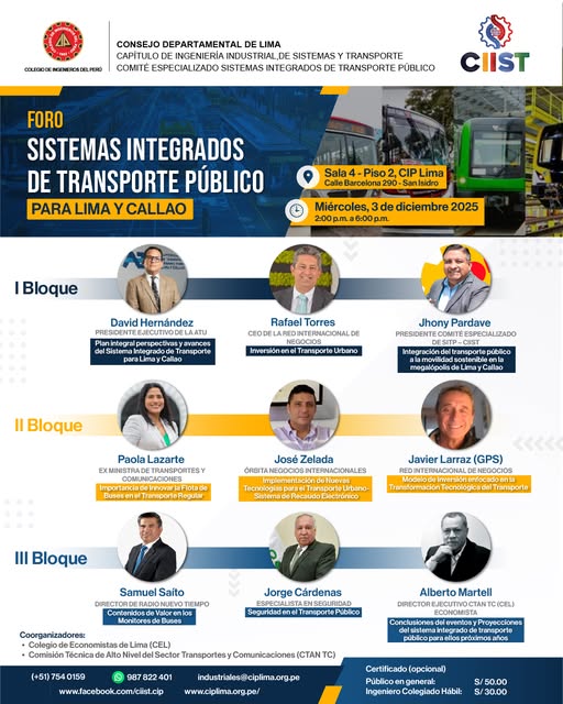 Foro: “Sistemas Integrados de Transporte Público para Lima y Callao” – Sala 4 / 03 diciembre, 2:00 p.m.