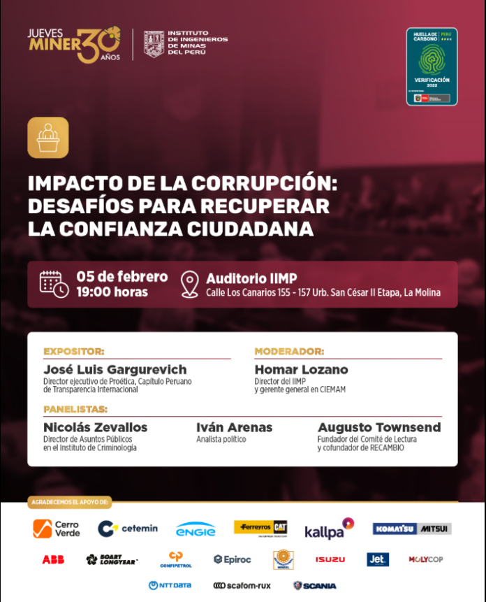 #JuevesMineroIIMP | Los invitamos a participar de nuestro tradicional Jueves Minero: “Impacto de la corrupción: desafíos para recuperar la confianza ciudadana”, a cargo José Luis Gargurevich, director ejecutivo de Proética, Capítulo Peruano de Transparencia Internacional, como expositor. La moderación estará a cargo de Homar Lozano, director del IIMP y gerente general en CIEMAM. Como panelistas participarán Nicolas Zevallos, Iván Arenas y Augusto Townsend.