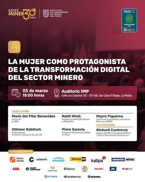 #JuevesMineroIIMP | Los invitamos a participar de nuestro tradicional Jueves Minero: “La mujer como protagonista de la transformación digital del sector minero”. La moderación estará a cargo de Richard Contreras, director del IIMP y Chief Operating Officer (COO) en Silver Mountain Resources Inc. Como panelistas participarán Maria del Pilar Benavides, Nahil Hirsh, Mayra Figueroa, Othmar Rabitsch y Piero Saravia.