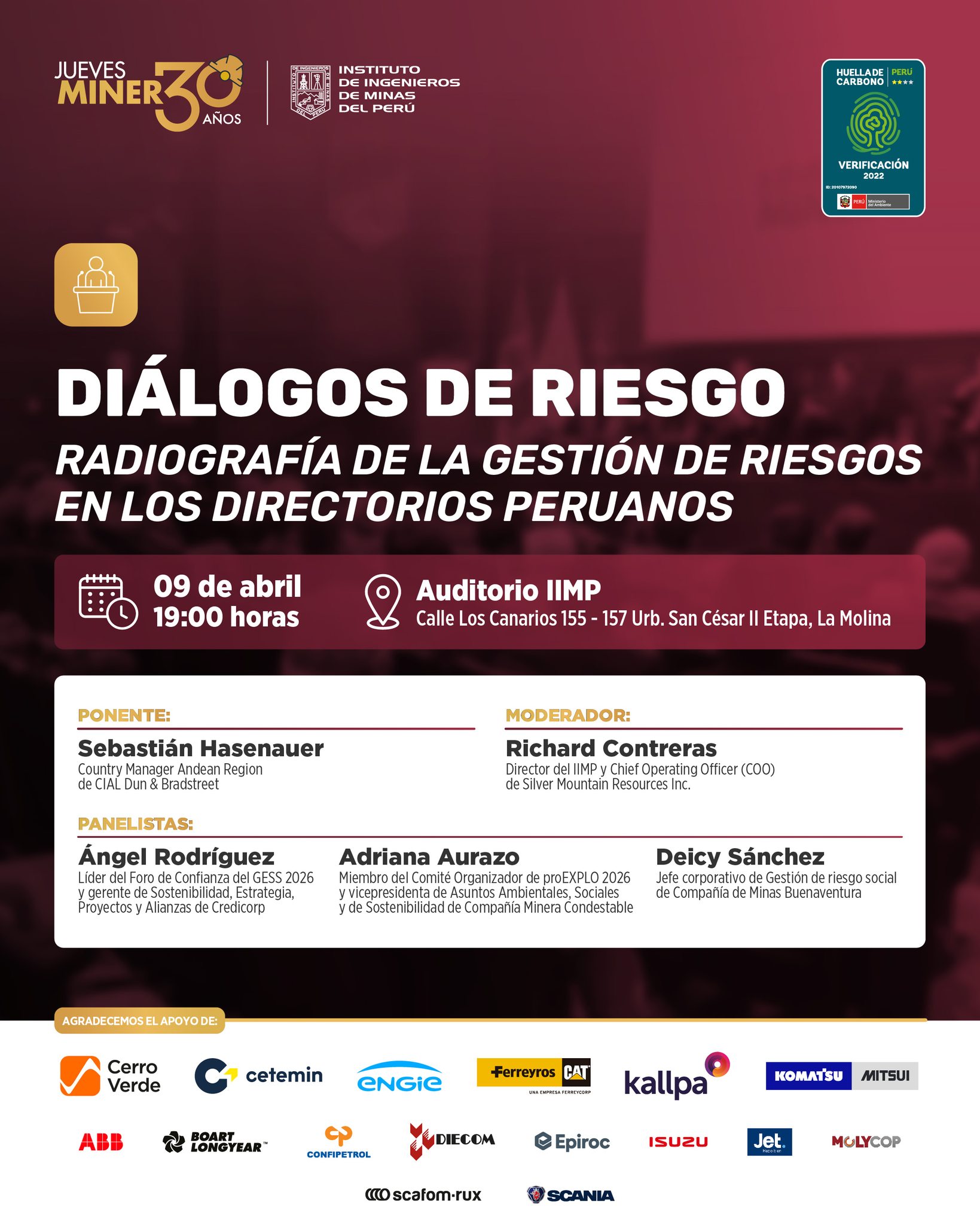 #JuevesMineroIIMP | Los invitamos a participar de una nueva edición de nuestro Jueves Minero. En esta ocasión, se llevará a cabo la conferencia “Diálogos de riesgo – radiografía de la gestión de riesgos en los directorios peruanos”, a cargo Sebastián Hasenauer, Country Manager Andean Region de CIAL Dun & Bradstreet, como expositor. La moderación estará a cargo de Richard Contreras, director del IIMP y Chief Opertating Officer (COO) de Silver Mountain Resources Inc. Como panelistas participarán Ángel Rodríguez, Adriana Aurazo y Deicy Sánchez.