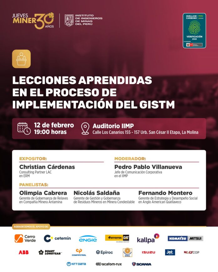 #JuevesMineroIIMP | Los invitamos a participar de nuestro tradicional Jueves Minero: “Lecciones aprendidas en el proceso de implementación del GISTM”, a cargo de Christian Cárdenas, Consulting Partner LAC en ERM, como expositor. La moderación estará a cargo de Pedro Pablo Villanueva, jefe de comunicaciones en el IIMP. Como panelistas participarán Olimpia Cabrera, Nicolás Saldaña y Fernando Montero.