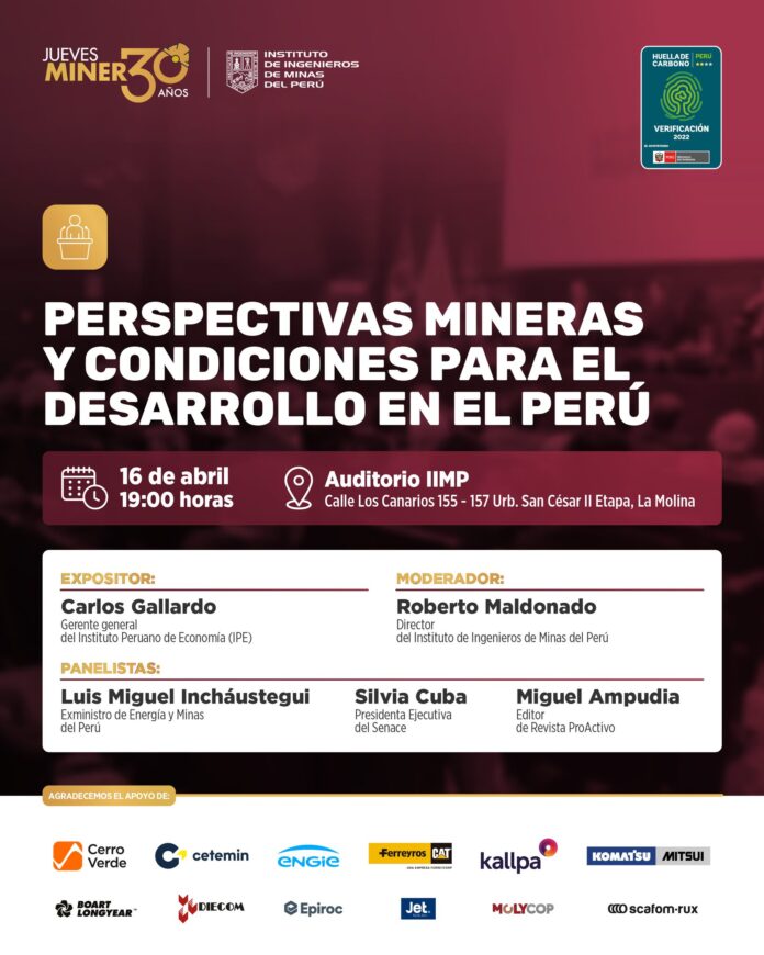 Jueves Minero del IIMP (16-04-2026): Conferencia “PERSPECTIVAS MINERAS Y CONDICIONES PARA EL DESARROLLO EN EL PERÚ” – Auditorio IIMP / 19h00.
