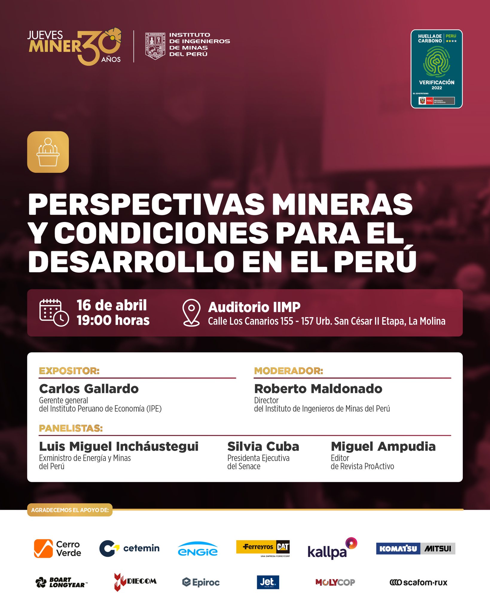 #JuevesMineroIIMP | Los invitamos a participar de una nueva edición de nuestro Jueves Minero. En esta ocasión, se llevará a cabo la conferencia “Perspectivas mineras y condiciones para el desarrollo en el Perú”, a cargo de Carlos Gallardo, gerente general del Instituto Peruano de Economía (IPE), como expositor. La moderación estará a cargo de Roberto Maldonado, director del IIMP. Como panelistas participarán Luis Miguel Incháustegui, Silvia Cuba y Miguel Ampudia.