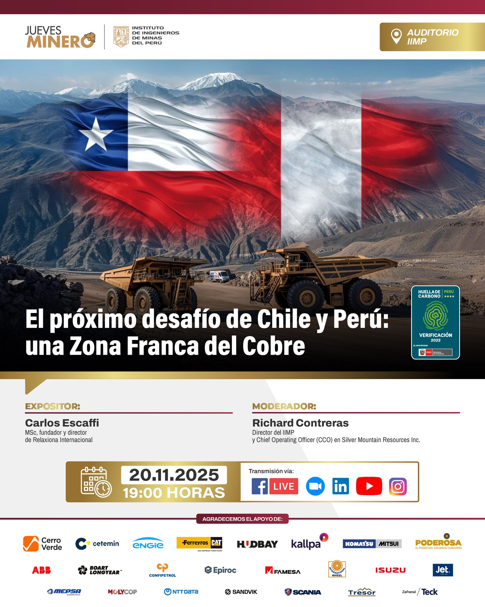 Jueves Minero del IIMP (20-10-25): “El próximo desafío de Chile y Perú: una Zona Franca del Cobre” / 19h00.