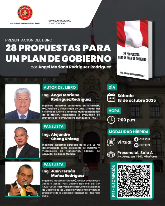El Colegio de Ingenieros del Perú – Consejo Nacional, a través de su Fondo Editorial, invita a todos los colegas y público interesado a la presentación del libro del Ing. Ángel Mariano Rodríguez Rodríguez, obra que propone una visión técnica e integral para el desarrollo del país.