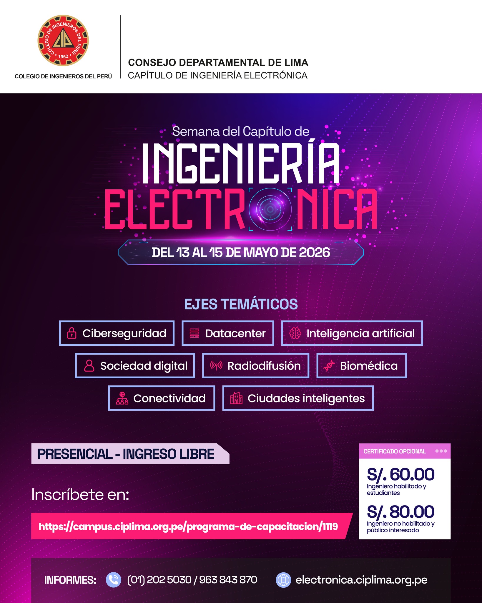 El Capítulo de Ingeniería Electrónica del CIP Lima te invita a ser parte de tres días de conocimiento, tendencias tecnológicas y networking con expertos del sector.